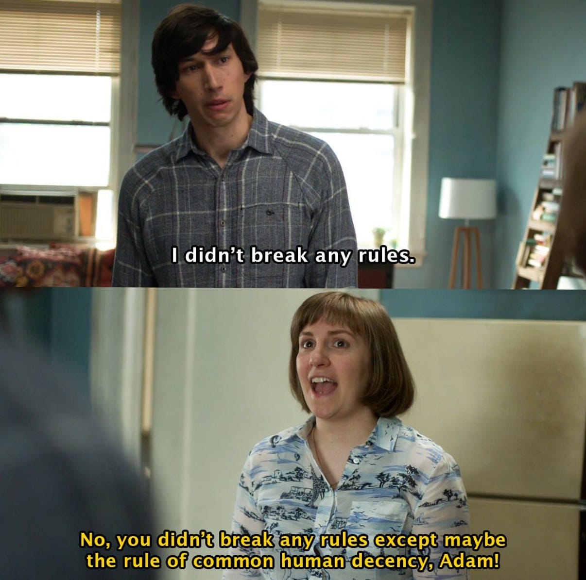 Season 4 starts off with Hannah having a goodbye party and Adam seems extremely sad and upset. On the morning she’s leaving, he pretends to be asleep instead of saying a proper goodbye. How mature of him, right? He is like a proper man-child. Something doesn’t go his way, so he’s gonna act like a brat.